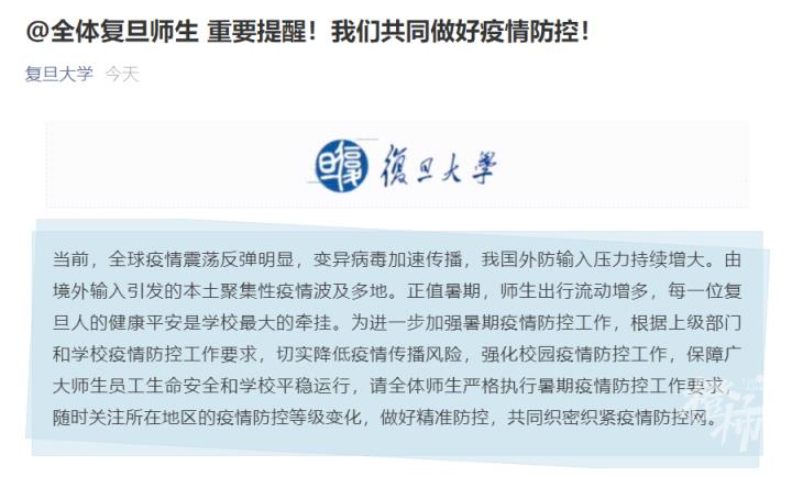 Fudan University issued a notice on epidemic prevention and control on August 4 to further tighten the management of epidemic prevention and control on campus.