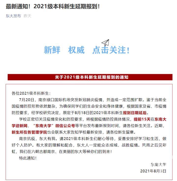 Southeast University: The school starts early on August 2, and the freshmen are postponed to report.