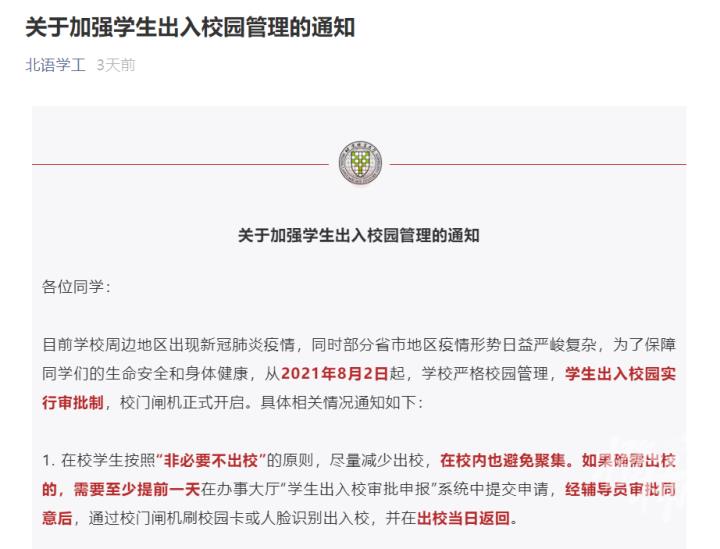 From August 2nd, beijing language and culture university issued a notice that the campus management will be strictly enforced, the examination and approval system will be implemented for students entering and leaving the campus, and the gate of the school gate will be officially opened. Students who are not in school in Beijing or have left Beijing should follow the principle of "not returning to school unless necessary" to reduce contact with people on the way and avoid unnecessary security risks. At the same time, students who have returned to their hometowns and live in high-risk areas or have been to high-risk areas for some reason will not return to school for the time being, consciously abide by local prevention and control policies, and do a good job in protection and daily health monitoring.