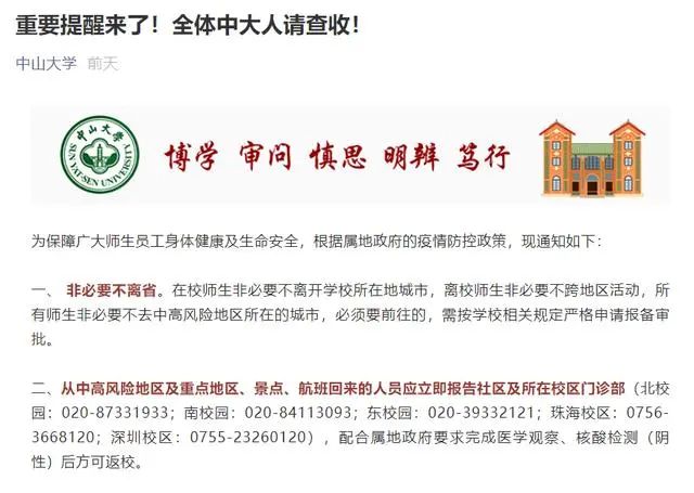 Sun Yat-sen University: Teachers and students in high-risk areas are suspended from returning to school.