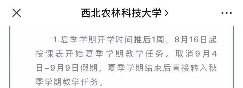 On August 3, Northwest A&F University issued a notice.The start of the summer semester was postponed by one week.Starting from August 16th, the summer semester teaching tasks will be started according to the curriculum. Cancel the holiday from September 4 th to September 9 th, and directly transfer to the autumn semester teaching task after the summer semester.Opening time of freshmen of 2021Temporarily according to the original time.