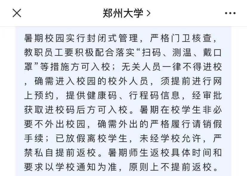 On August 3, Zhengzhou University issued a notice that students who have left school on holiday are strictly prohibited from returning to school in advance without the permission of the school. Summer teachers and students return to schoolSpecific time and requirementsSubject to the school notice, in principle, do not return to school in advance.