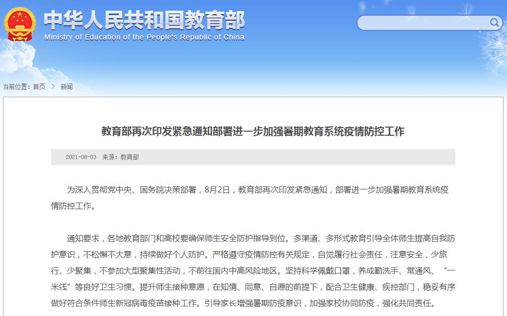Cctv newsWith the situation of epidemic prevention and control tightening, on August 2, the Ministry of Education issued an urgent notice again, requiring local education departments and universities to ensure that teachers and students’ safety protection guidance is in place, strictly control the organization of large-scale activities, further improve the emergency work plan, and ensure the normal operation of the summer epidemic prevention and control system. At present, many colleges and universities have issued the latest requirements for summer vacation and school opening.