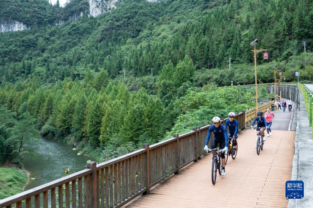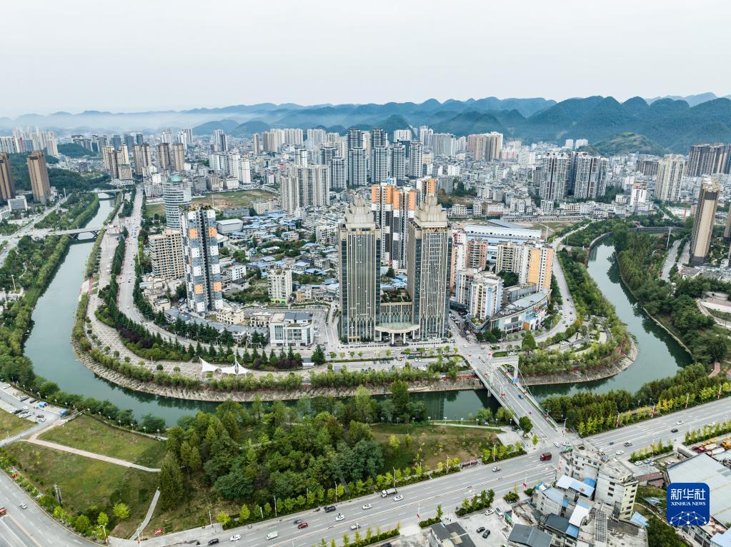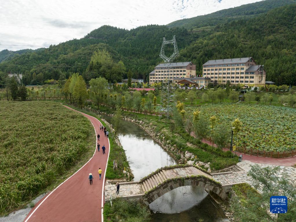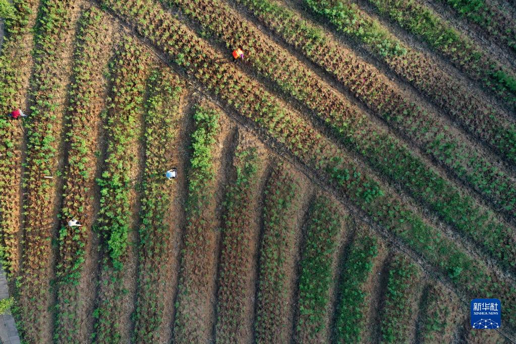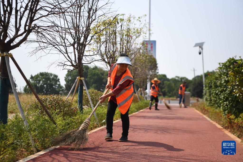 On September 28, 2022, in Dadukou Town, Naxi District, Luzhou, Sichuan, workers maintained trees in the green space along the Qingxi River, a tributary of the Yangtze River.