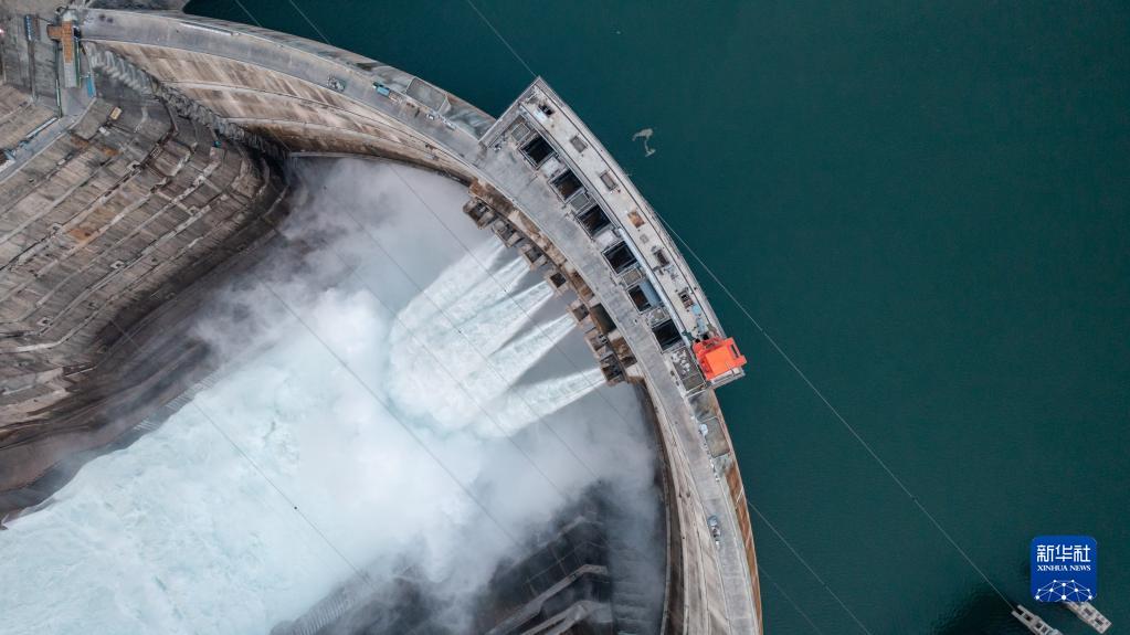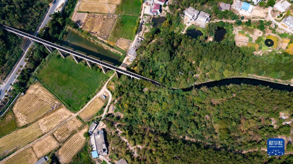 The reservoir water of Bailianhe Reservoir in Hubei Province flows to Xishui County and Qichun County of Huanggang City through the East Main Canal (photo of drone, taken on September 27, 2022).