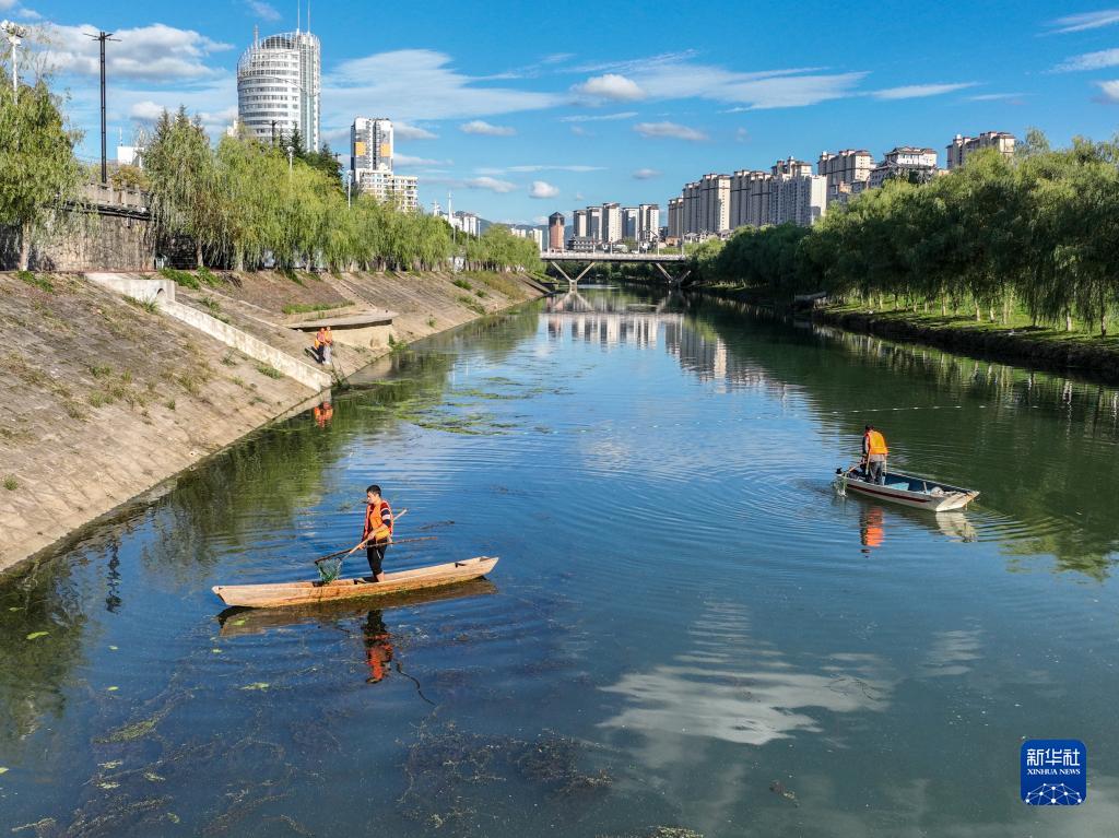 On September 28, 2022, in Dadukou Town, Naxi District, Luzhou, Sichuan, workers pruned plants in the green space along the Qingxi River, a tributary of the Yangtze River.